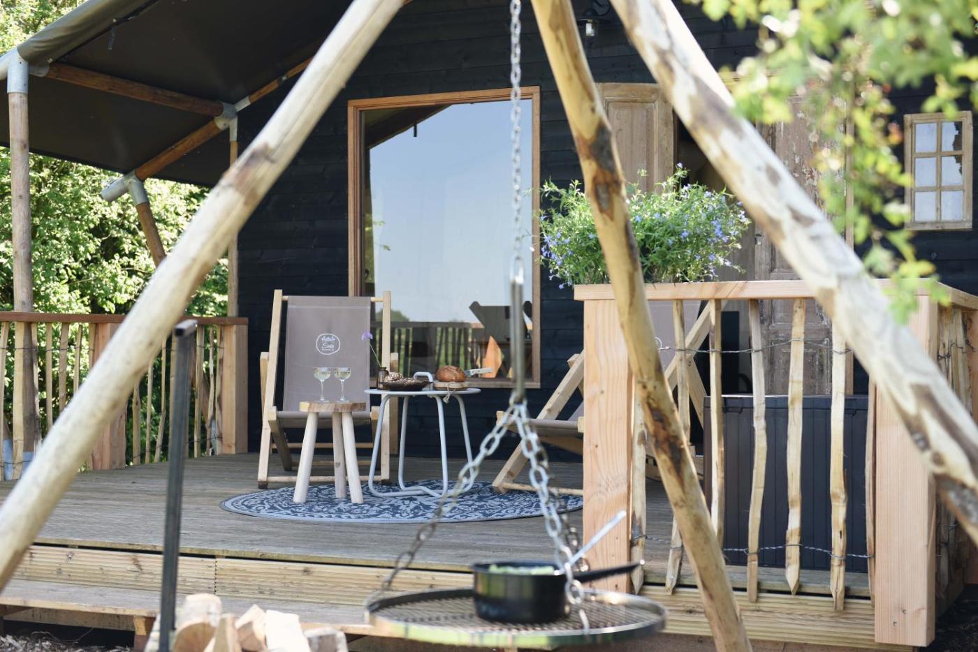 Tent. Guests will have a special experience as this tent features a hot tub and a fireplace. Guests will find a stovetop, a refrigerator and kitchenware in the kitchen. The tent also has a barbecue. The tent offers a tea and coffee maker, a seating area, a terrace with lake views as well as a private bathroom featuring a shower. The unit offers 3 beds.