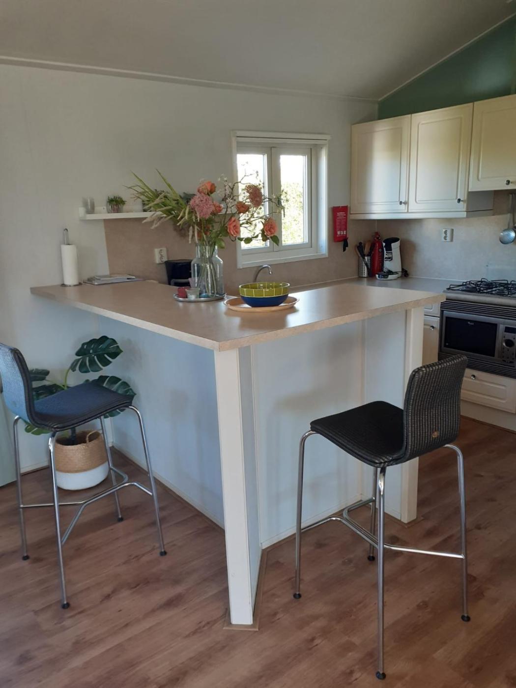 Two-Bedroom Chalet. The chalet has 2 bedrooms, 1 with a double bed and 1 with 2 single beds. There are also 2 additional folding beds. These can be used to2 sleeping places in the living room.